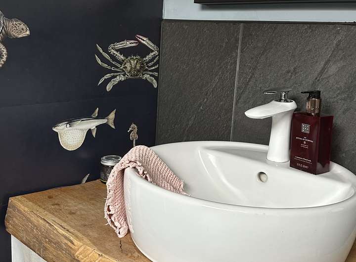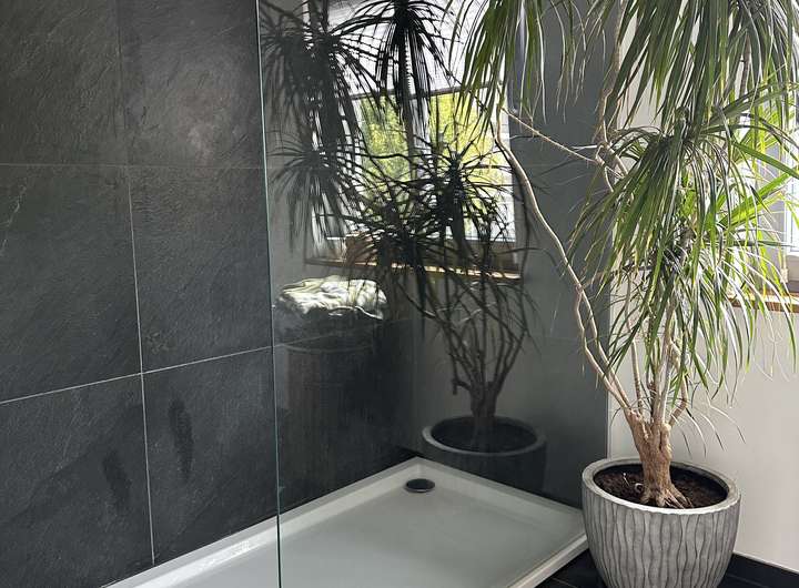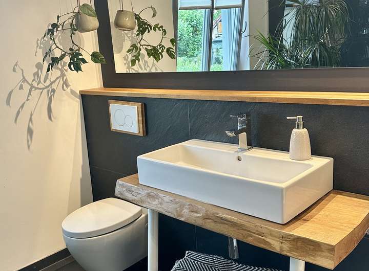 Im gesamten Wohnbereich wurde ein Eichen-Fertigparkett verlegt, in den Bädern und im Eingangsbereich großformatige Fliesen.