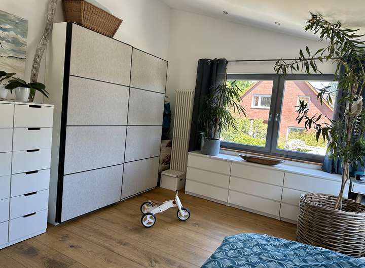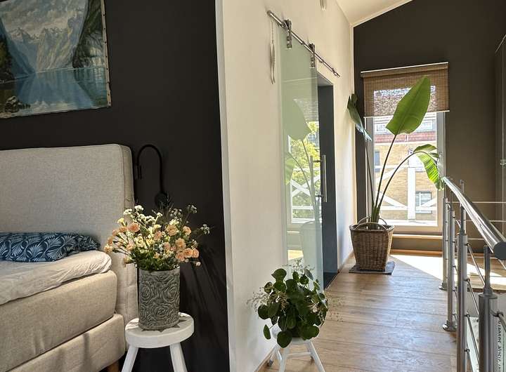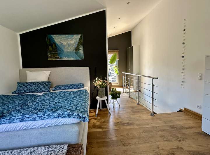 Im OG befindet sich das Schafzimmer mit einem Duschbad und dem Zugang zum Balkon.