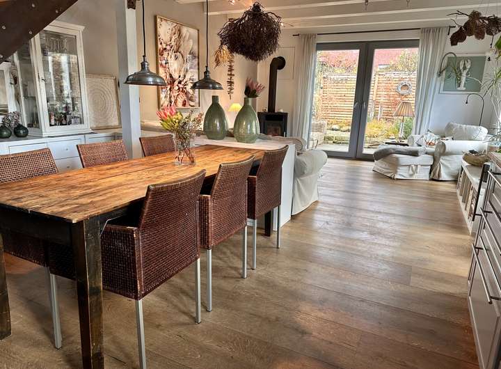 Das EG bietet ein großzügiges Wohn-/Eßzimmer mit einem Kaminofen, einer Küchenzeile sowie ein Gäste-WC mit Waschmaschinenanschluß. Hier befindet sich auch die Gastherme (Viessmann). Das EG ist mit einer Fußbodenheizung ausgestattet.