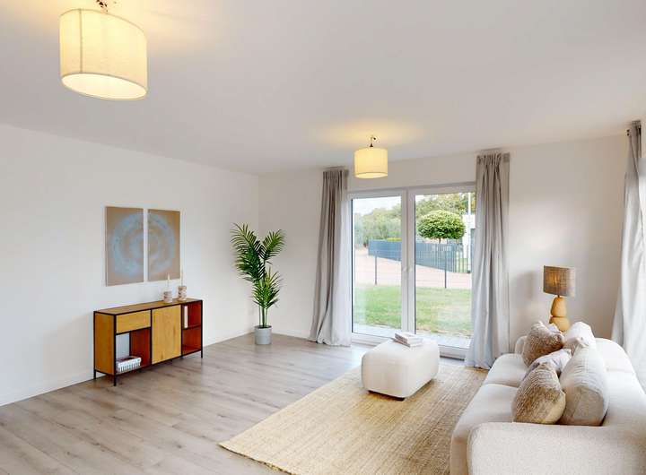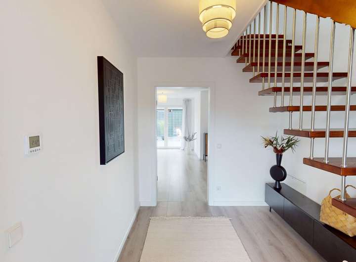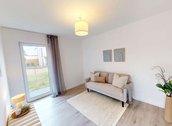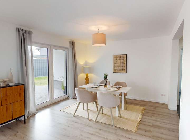 Schon beim Betreten der Immobilie wird die durchdachte Raumgestaltung sichtbar: Der offene, lichtdurchflutete Wohn- und Essbereich bildet das Herzstück des Hauses. Bodentiefe Fenster schaffen ein helles, freundliches Ambiente und öffnen den Blick auf die in Richtung Süden ausgerichtete Terrasse, die sich ideal für sonnige Stunden mit der Familie oder gesellige Abende mit Freunden eignet.