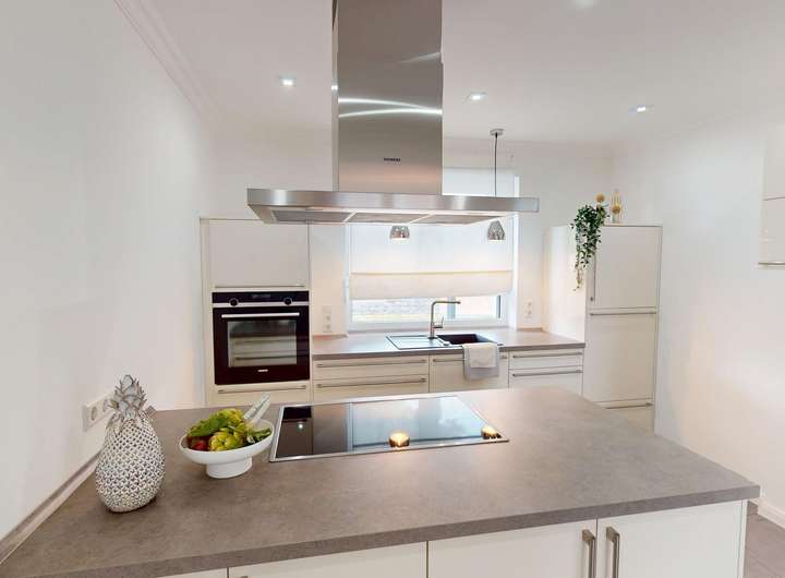 Die hochwertige Einbauküche ist nicht nur funktional, sondern fügt sich stilvoll in das moderne Gesamtbild ein – ein echter Treffpunkt für gemeinsame Kochmomente. Direkt angrenzend befindet sich ein praktischer Hauswirtschaftsraum, der kurze Wege garantiert und zusätzlichen Stauraum für Vorräte, Haushaltsgeräte oder Waschmaschine bietet.