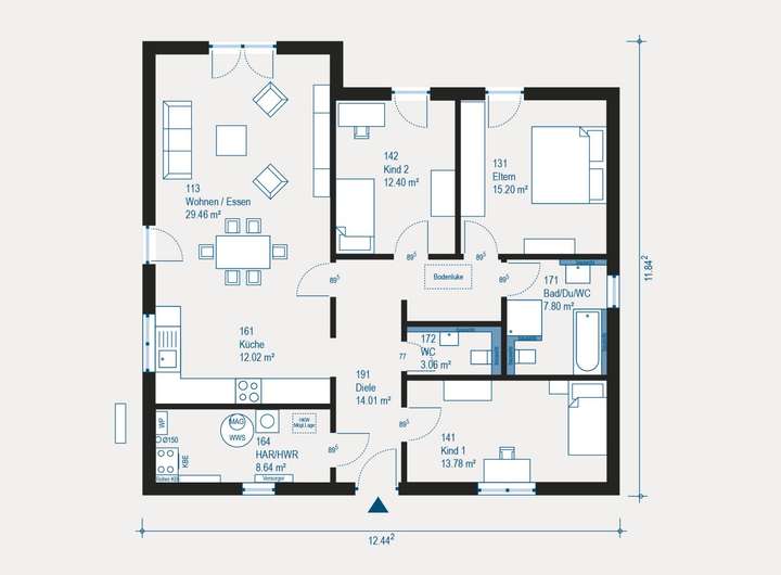 Lifetime 4 ist mit einer Grundfläche von über 110 Quadratmetern ein ideales Haus für die ganze Familie. Die intelligente Raumaufteilung mit einem sehr großzügigen Wohnzimmer mit Essbereich und direktem Zugang zur Terrasse, zwei separaten Kinderzimmern sowie einem Elternschlafzimmer, bietet traumhafte Wohnbedingungen.