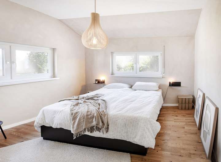 mit Ankleide, ein schönes Bad und ein Arbeitsbereich finden ebenfalls bequem im Obergeschoss Platz. Giebelseitig