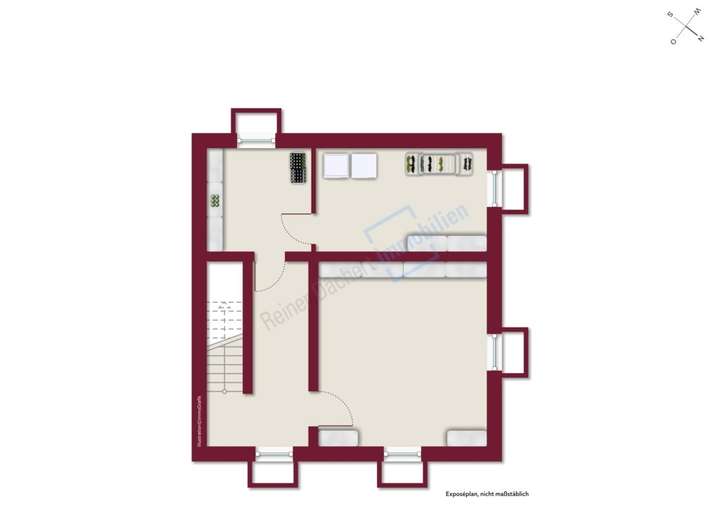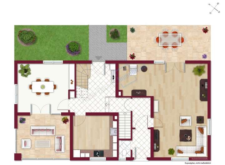 Die tatsächliche Bauausführung, Genehmigungsstände u.Ä. gehen daraus nicht hervor. Die aus den Grundrissen hervorgehenden Informationen haben keinen Anspruch auf Vollständigkeit oder Richtigkeit und sind nicht rechtsverbindlich.
