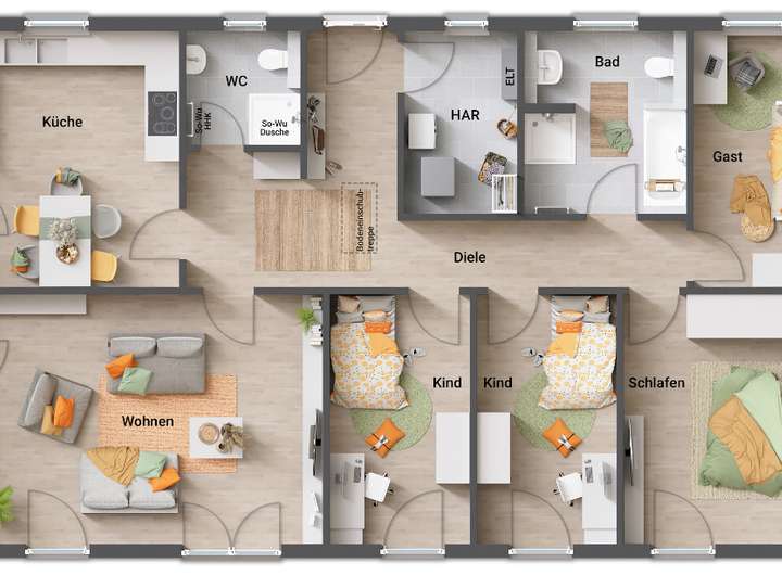 Unser Bungalow 131 hat es in sich – zwei Kinderzimmer, zwei Bäder, Schlafzimmer und Gästezimmer – viel Wohnfläche und clever nutzbarer Stauraum für die ganze Familie. Frühstücken Sie in der großen Wohnküche mit ihren Lieben und planen gemeinsam den Tag. Das traumhafte Wohnzimmer mit seinen großen Fenstern ist der perfekte Ort zum Entspannen, bietet freien Blick in Ihren Garten und mit wenigen Schritten sind Sie auf Ihrer Terrasse im Grünen. Dank bodentiefer Fenster sind die Wohnräume lichtdurchflutet und geben ein besonderes Wohngefühl. Das geräumige Schlafzimmer rundet das Raumangebot ab und machen Ihr Traumhaus zum Begleiter in allen Lebensphasen. Ihr Badezimmer gestalten Sie als Ihre ganz persönliche Wohlfühloase. Das Gäste-WC bietet Platz genug für eine Dusche und entspannt Ihr Zusammenleben.