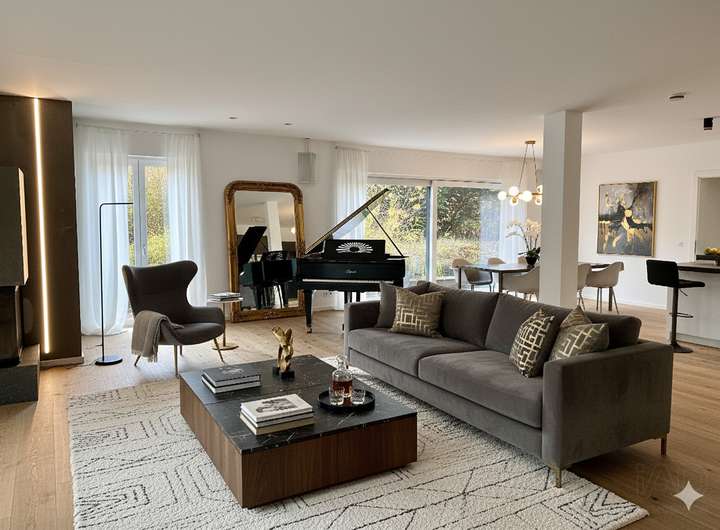 Mit ca. 494 m² Wohnfläche, insgesamt 10 Zimmern, mehreren Terrassen und einem idyllischen Schwimmteich bietet das Anwesen ideale Voraussetzungen für Familien, Mehrgenerationenwohnen oder die Kombination aus Leben und Arbeiten. Jede Ebene präsentiert sich elegant, großzügig und funktional.