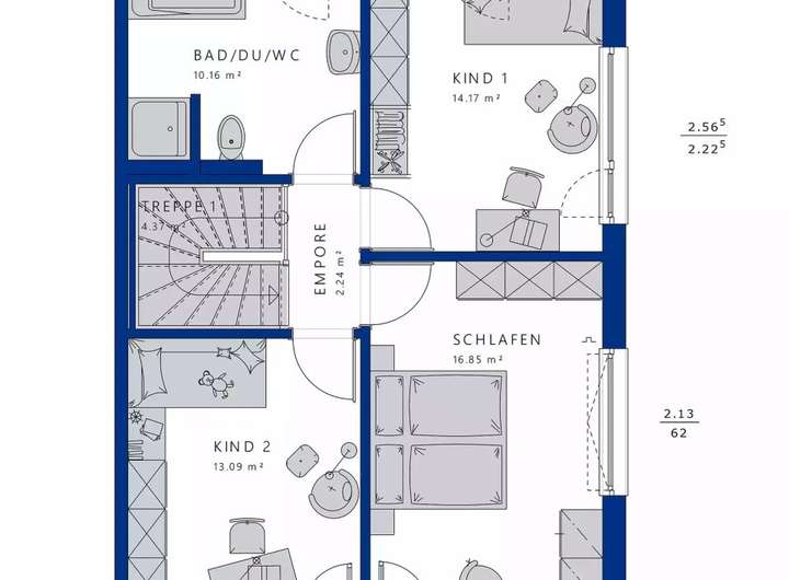 Auf beiden Ebenen öffnen großzügige Fensterfronten das Gebäude seiner Umgebung. An den Seiten wurden hohe Brüstungsgeländer vor die raumhohen Verglasungen gesetzt. Betreten wird das stylishe Doppelhaus über einen kompakten Windfang. Hier können schon einmal die Schuhe und die Jacken ausgezogen werden, bevor man weiter in das Innere vordringt. Rechts schließt sich die Gästetoilette an. Über einen offenen Durchgang gelangt man in den Flur, in den sich der Treppenaufgang harmonisch integriert. Er mündet in den großzügigen Wohn-, Ess- und Kochbereich, der dank der breiten Fensterfront mit Tageslicht geflutet wird. Besonders praktisch ist der zweite Zugang zur Küche. So kann man die schweren Wochenendeinkäufe auf kurzem Weg zu den Vorratsschränken bringen. Bei der Küchengestaltung sind die zukünftigen Hausbesitzer flexibel: Auf den mehr als 6 m² lässt sich sowohl eine L-förmige Küchenzeile als auch eine U-förmige Küche mit Theke realisieren. Serviert werden die Speisen auf dem großen Esstisch vor der raumhohen Festverglasung. Von hier aus eröffnet sich ein wundervoller Ausblick ins Grüne. An warmen Tagen kann das gemeinsame Essen auch nach draußen auf die weitläufige Terrasse verlagert werden. Das Obergeschoss steht ganz im Zeichen von Ruhe und Entspannung. Um eine Empore gruppieren sich zwei geräumige Kinderzimmer, der Elternschlafraum sowie ein Wellnessbad für Groß und Klein. Abgerundet wird das Raumangebot des Doppelhauses von einer Abstellkammer sowie einem Technikraum.