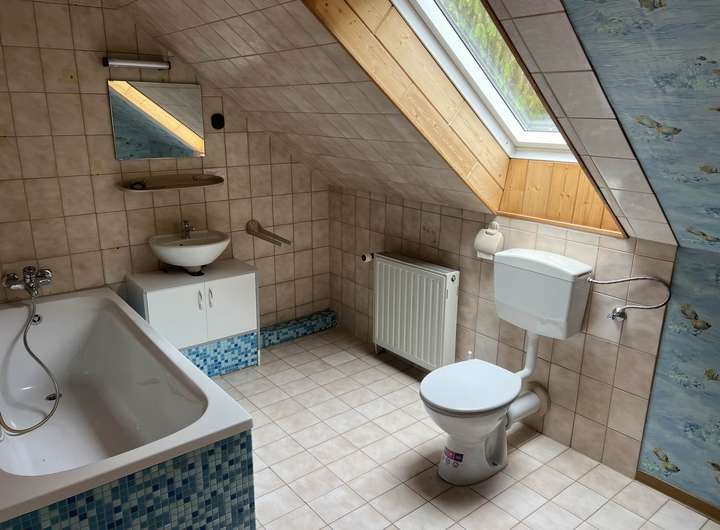 - Badezimmer im OG mit WC, Waschtisch und Badewanne.