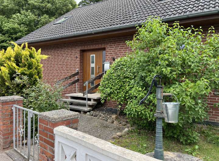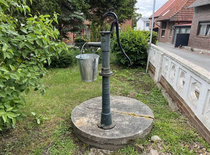 - Im Vorgarten eine Zisterne mit Schwengelpumpe.