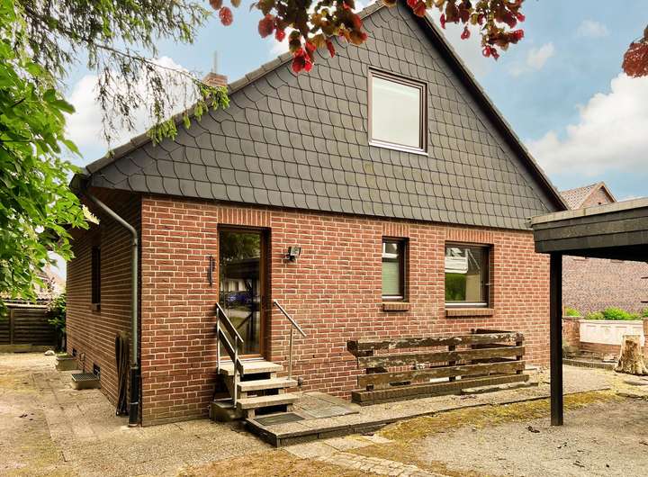 Das Haus besticht durch seine grundsolide Bauweise mit Vollklinkerfassade, durchdachter Grundrissstruktur und lichtdurchfluteten Räumen. Erd- und Dachgeschoss sind vollständig zu Wohnzwecken ausgebaut. Ein Carport sowie zwei Abstellschuppen ergänzen das Platzangebot im Außenbereich. Die Terrasse auf der Südseite bietet Potenzial für eine attraktive Gartengestaltung.