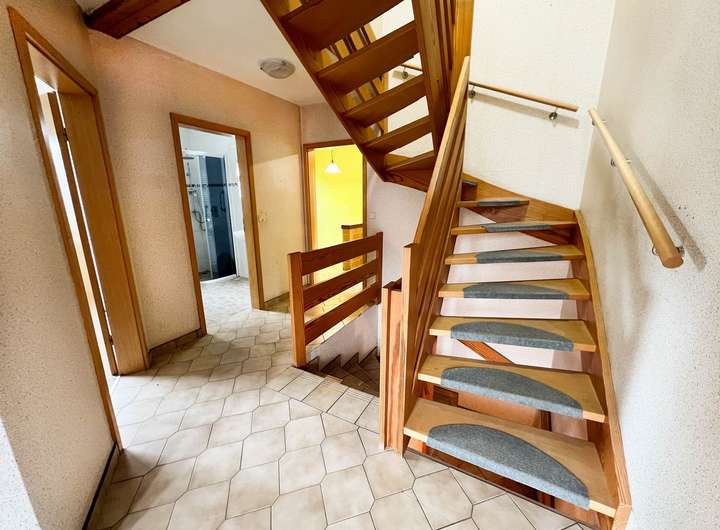 - Treppenlauf vom Keller in das EG massive Treppe mit gefliesten Stufen. Treppenlauf vom EG ins OG offene Holzwangentreppe.