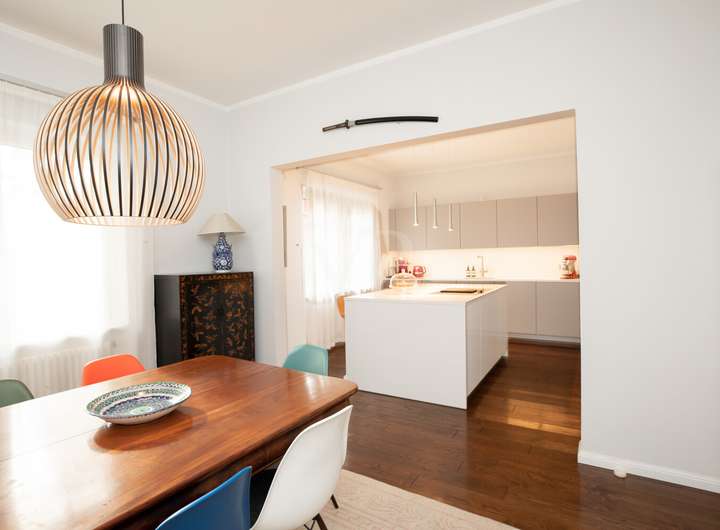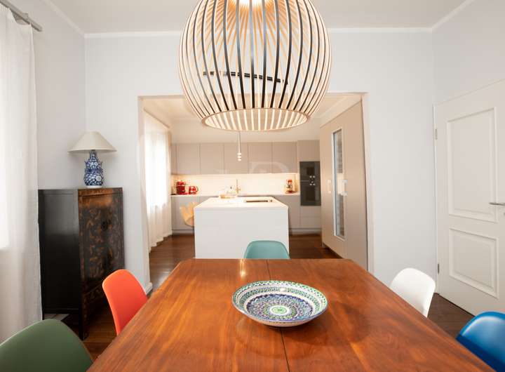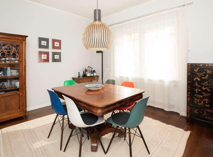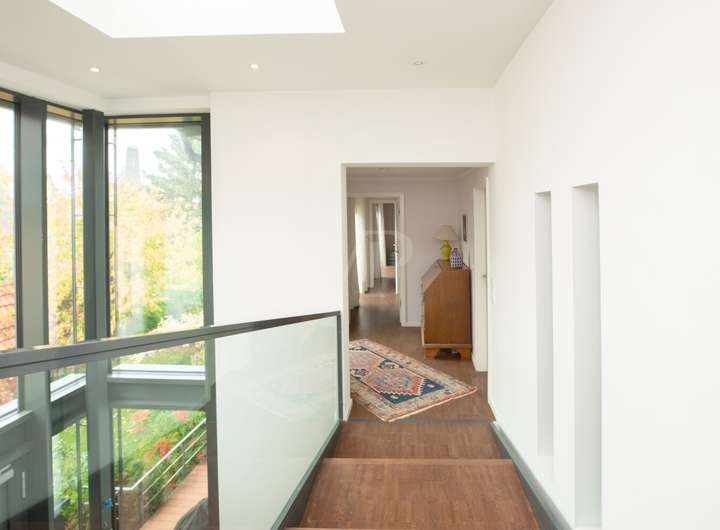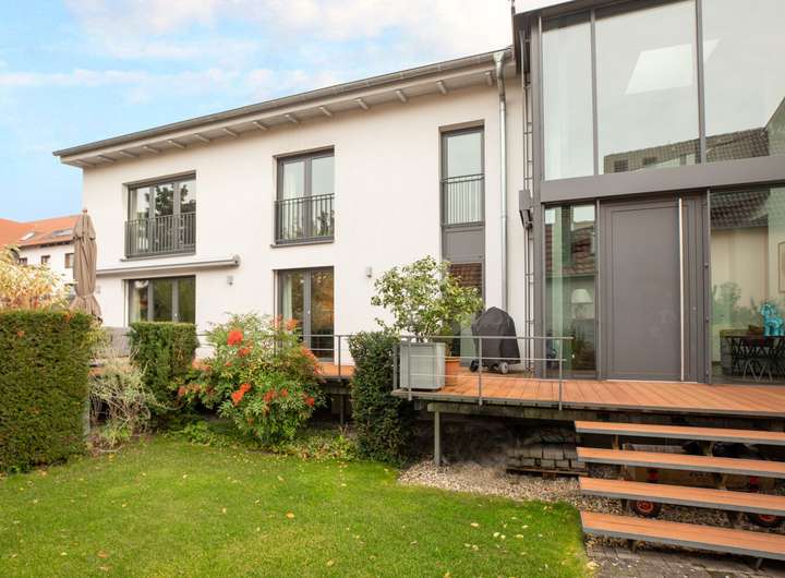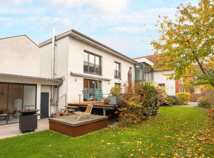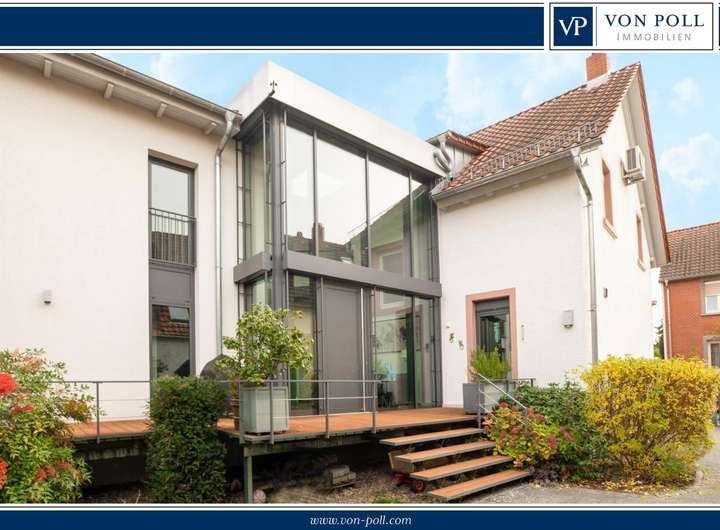 Unmittelbar vor den Toren der Main-Metropole Frankfurt erwartet Sie dieses luxuriöse Refugium. Die Immobilie besteht aus zwei unterschiedlichen Gebäudeteilen, die durch ein gläsernes Entrée ein harmonischer Weise zu einer Einheit verbunden wurden. Um 1900 und 1960 errichtet, wurde die Immobilie in den zurückliegenden Jahren vollständig sehr hochwertig und geschmackvoll saniert. Dies mit Bedacht auf den Erhalt des ursprünglichen Charmes. Heute präsentiert sich die Immobilie als großzügiges Einfamilienhaus mit zeitgemäßem Komfort. Auf zwei Etagen stehen insgesamt ca. 246 qm Wohnfläche zur Verfügung, die sich auf 8 Zimmer verteilen. Hierzu zählt das großzügige Wohnzimmer mit Kaminofen und raumhohen Fensterelementen. Diese erlauben den Zugang zur Terrasse und zum Garten. Des Weiteren das Esszimmer, welches fließend in die offen gehaltene Küche mit Kochinsel übergeht. Diese präsentiert sich mit einer Ausstattung der Marke Poggenpohl und Gaggenau Elektrogeräten sowie einem Weinkühlschrank state of the art. Die obere Etage des Hauses ist dem privaten Bereich vorbehalten. Für ein komfortables Miteinander sorgen zwei hochwertige Tageslichtbadezimmer. Einige Schlafzimmer verfügen über eine Klimaanlage. Zum weiteren Wohlbefinden trägt der professionell gestaltete Garten bei, der nahezu uneinsehbar ist und dadurch ein hohes Maß an Privatsphäre gewährleistet. Über die großzügig angelegte Terrasse gelangt man zum Naturpool nebst Poolhaus. Ein Brunnen sowie eine Gartenbewässerungsanlage unterstützen die Pflege der Außenanlagen.