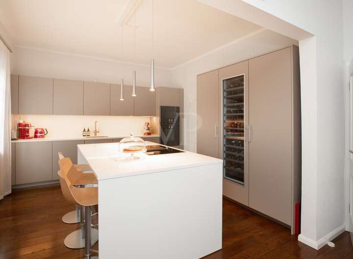 •offene Küche / Einbauküche (Poggenpohl) mit Kochinsel und Weinkühlschrank