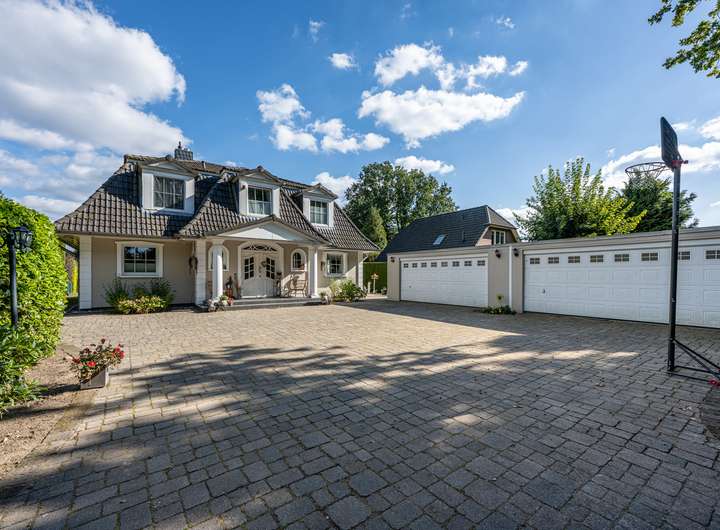 Komfort und Sicherheit stehen ebenso im Fokus: Eine moderne Alarmanlage mit Aufschaltung, eine Gegensprechanlage, ein elektrisch gesteuertes Einfahrtstor sowie zwei Doppelgaragen auf der weitläufigen Auffahrt runden das Angebot ab. Das markante Mansarddach verleiht dem Anwesen zudem einen unverwechselbaren, stilvollen Charakter.