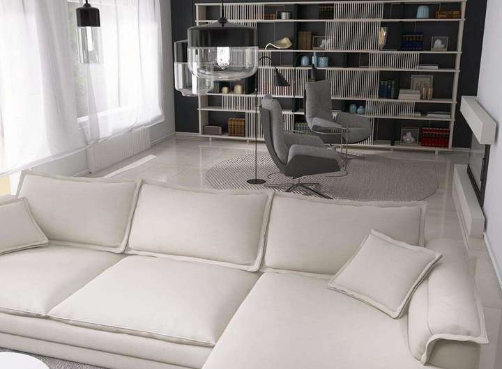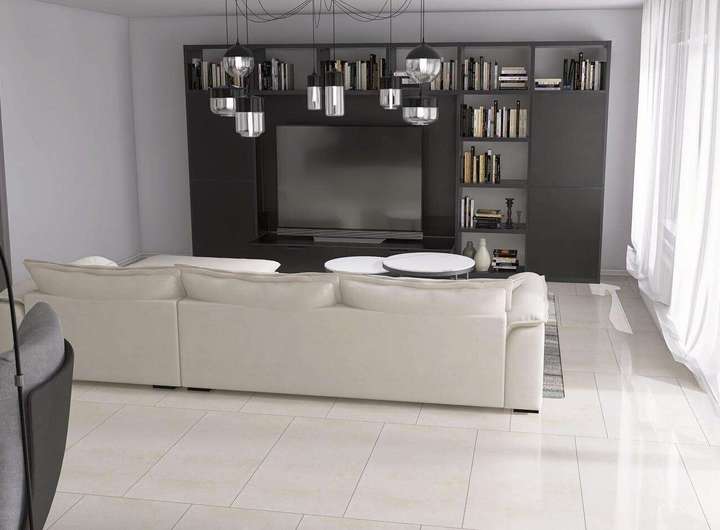 Einheitliche großformatige Fliesen erzeugen eine ruhige, moderne Optik, während in den Obergeschossen Parkett für Behaglichkeit sorgt.