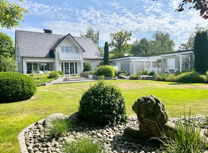 Der Garten ist ein Highlight mit mehreren Sitzbereichen, Terrassen am Wasser und einem Grill-Rondell. Eine automatische Bewässerungsanlage hält alles grün. Platz für Pool oder Gästehaus vorhanden. Zwei Garagen, Carport und weitere Stellplätze ermöglichen reichlich Parkmöglichkeiten.