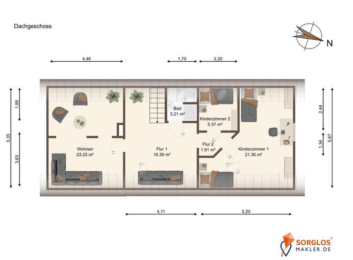 Im Dachgeschoss finden neben zwei Kinderzimmern auch ein weiterer Wohnraum Platz, der viele Nutzungsmöglichkeiten nach ihren Vorstellungen bietet. Das Tageslichtbad rundet das Raumprogramm stimmig ab.