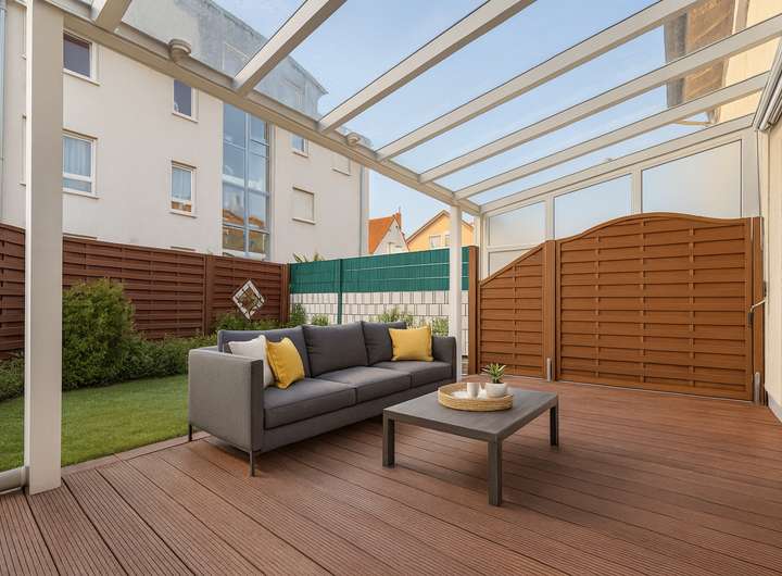 Der kleine, pflegeleichte Garten bietet den idealen Rückzugsort nach einem langen Tag – genug Platz zum Entspannen, Grillen oder als Spielbereich, ohne dass große Pflegearbeiten notwendig sind.