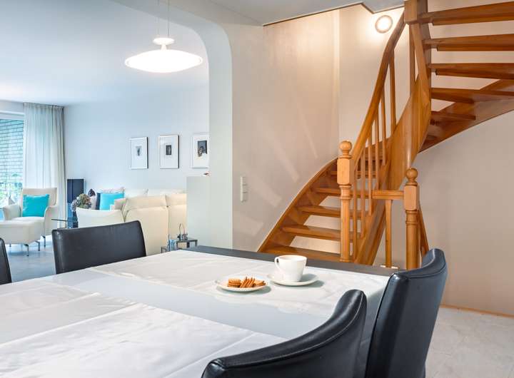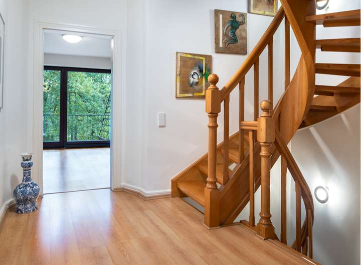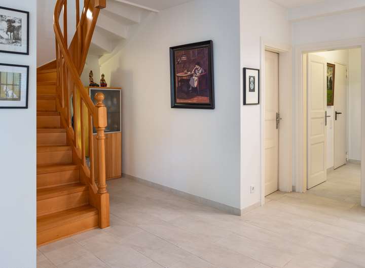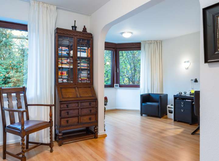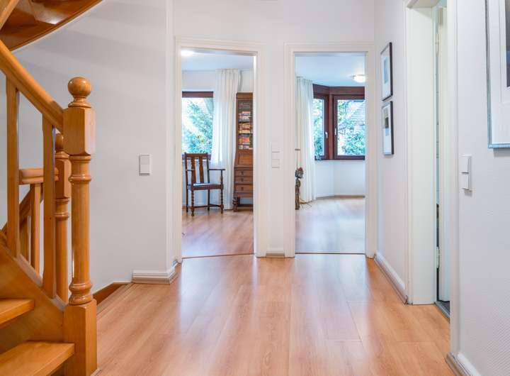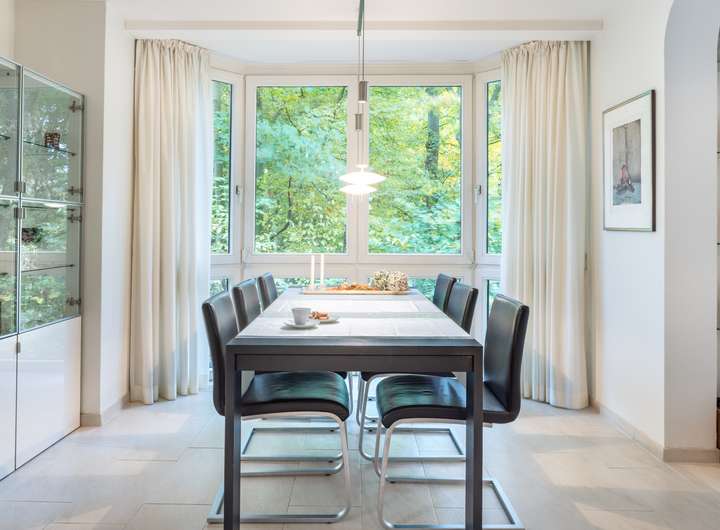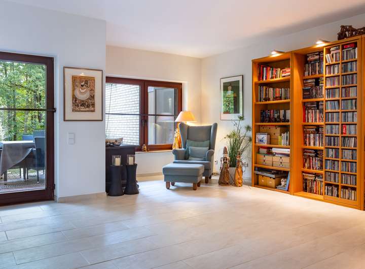 Im Inneren überzeugt das Haus mit rund 237 m² Wohnfläche, lichtdurchfluteten Räumen und einem harmonischen Grundriss. Der großzügige Wohn- und Essbereich mit seinem charakteristischen Erker öffnet sich mit weitläufigen Fensterflächen zum Grün des Waldes und lädt zu entspannten Stunden mit Familie und Freunden ein. Der Balkon bietet einen friedvollen Rückzugsort, während die Küche genügend Platz für gemeinsames Kochen und das tägliche Miteinander bietet.