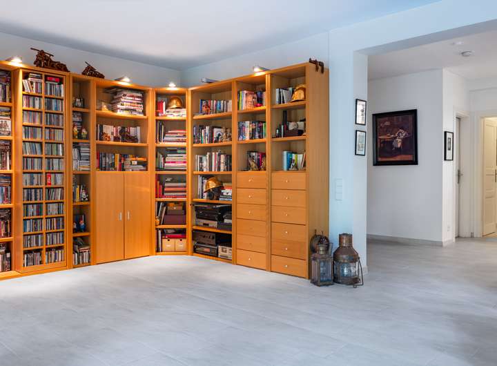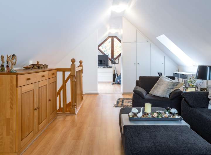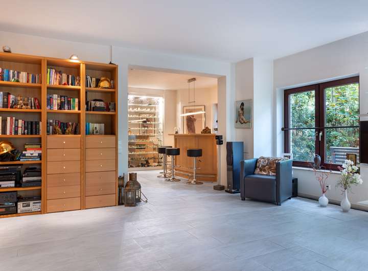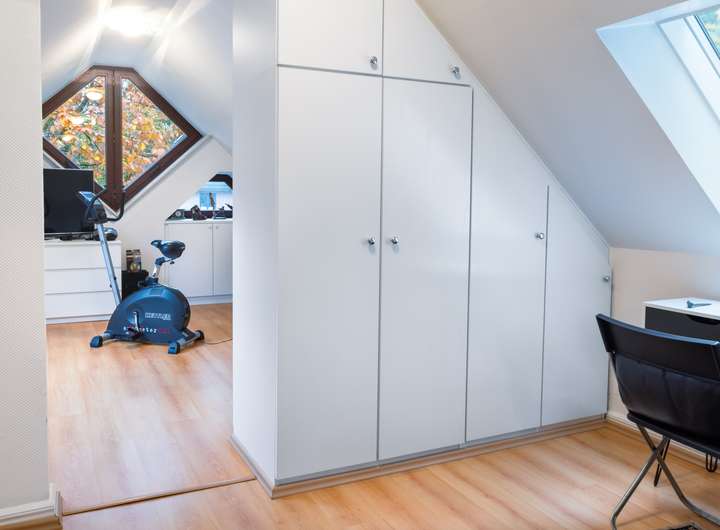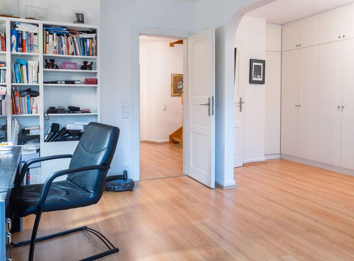Im Obergeschoss erwarten Sie ein sehr geräumiges Schlafzimmer, ein Büro sowie eine komfortable Ankleide, die den privaten Bereich angenehm strukturiert. Das große Dachstudio mit etwa 40 m² eröffnet vielseitige Nutzungsmöglichkeiten, sei es als Jugendzimmer, Atelier oder ruhiger Arbeitsraum. Das Souterrain erweitert das Haus um einen Hobbyraum, ein Bad und weitere Flächen, die perfekt für Spielbereiche, Fitness oder Gäste geeignet sind.