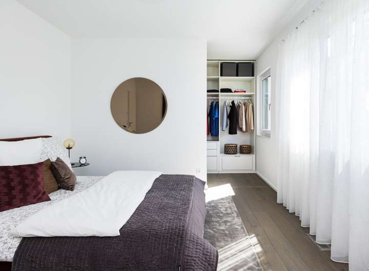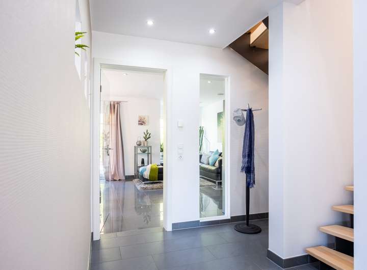 Im Eingangsbereich entsteht durch die große Garderobe gleich nach dem Gäste-WC ein besonders offenes Raumgefühl. Hier ist unter der Treppe ausreichend Stauraum vorhanden.