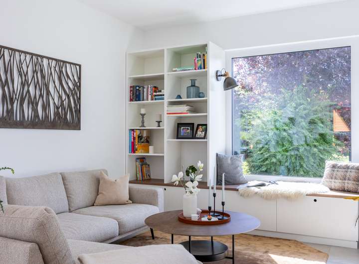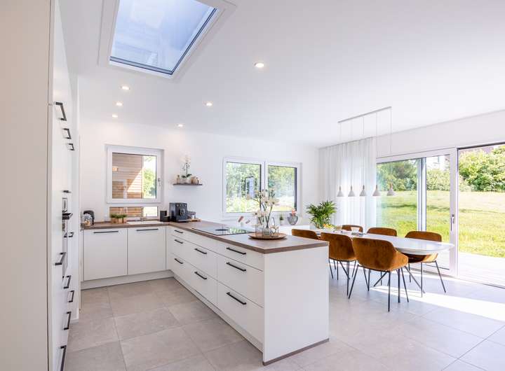 Im EG liegt der großzügige, lichtdurchflutete Mittelpunkt des Hauses mit einem Wohnbereich von über 32 m², mit 2 Fenstern und einer großen Tür in den Garten, inkl. offener Küche.