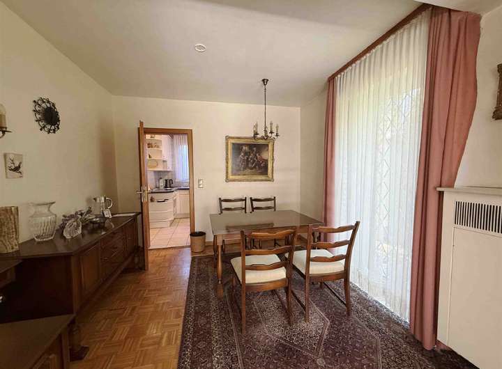 sonnendurchflutetes Wohnzimmer mit Zugang zur Terrasse und Garten, Küche, gemütlicher Essbereich,
