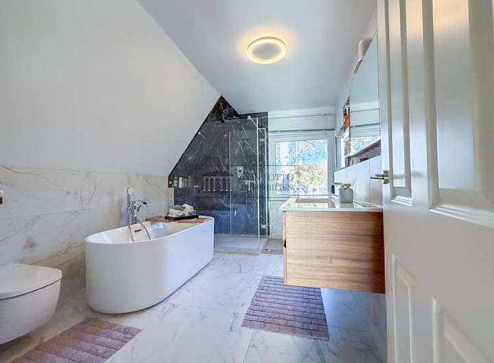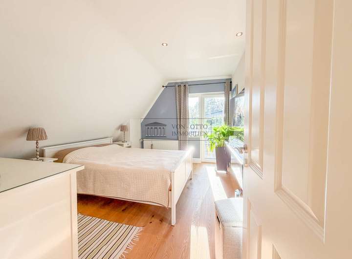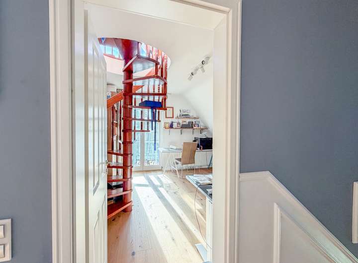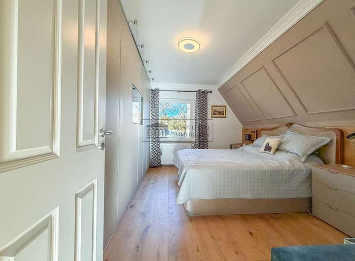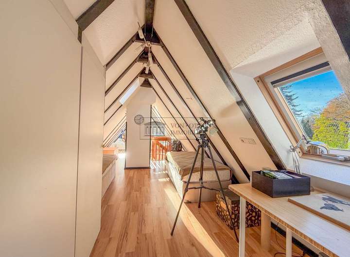Über eine schöne Holztreppe gelangen Sie in das Obergeschoss mit drei gemütlichen Zimmern und einem weiteren Badezimmer. Das ausgebaute Dachgeschoss bietet ein großes Studiozimmer mit eigenem Duschbad – ideal als Homeoffice, Teenagerzimmer oder privates Refugium.