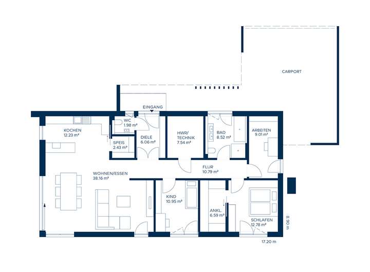 Concept 6 denkt den Bungalow neu – als monolithischen Baukörper mit charakterstarkem Satteldach, klarer Formensprache und eleganter Funktionalität auf einer Ebene. Die Komposition aus ruhigen Wandflächen, raumhohen Verglasungen und gezielt eingesetzten Sichtachsen erzeugt ein Wohngefühl, das von Weite, Licht und Leichtigkeit getragen wird.
