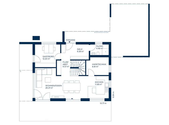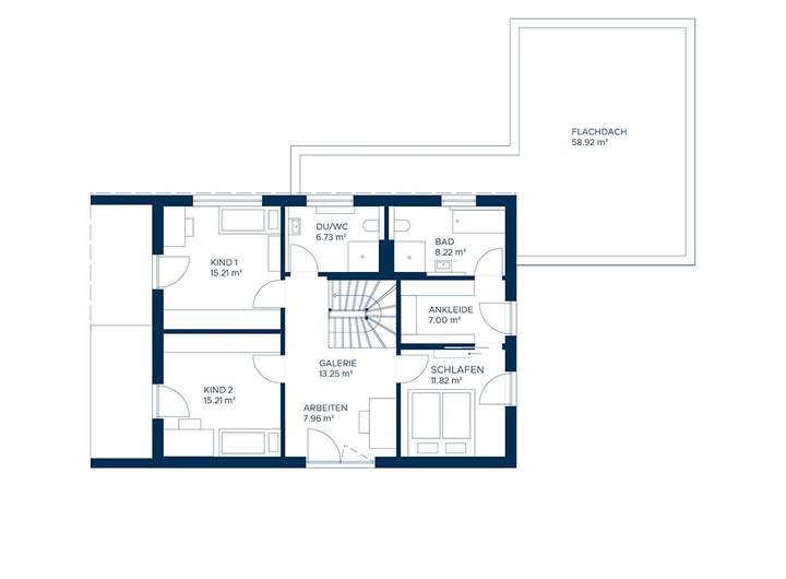 Innen überzeugt das Concept 5 durch kluge Raumaufteilung und natürliche Großzügigkeit. Im Erdgeschoss schafft der offen zonierte Wohn-, Ess- und Kochbereich fließende Übergänge und gleichzeitig Struktur. Der großzügige Hauswirtschaftsraum sorgt für Alltagstauglichkeit mit Stil. Im Obergeschoss eröffnen sich über die lichtdurchflutete Galerie zwei gleich große Kinderzimmer und ein ruhiger Rückzugsort für die Eltern – mit Ankleide, Bad und Sichtachsen ins Grüne.