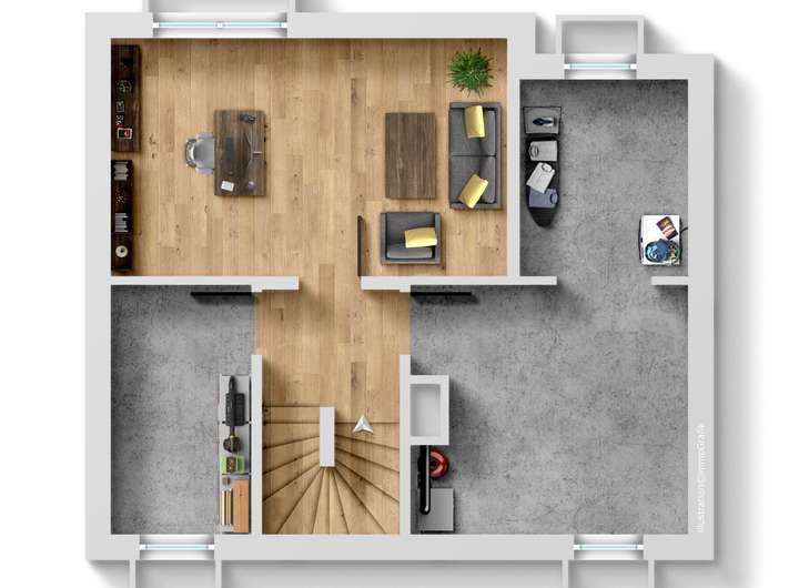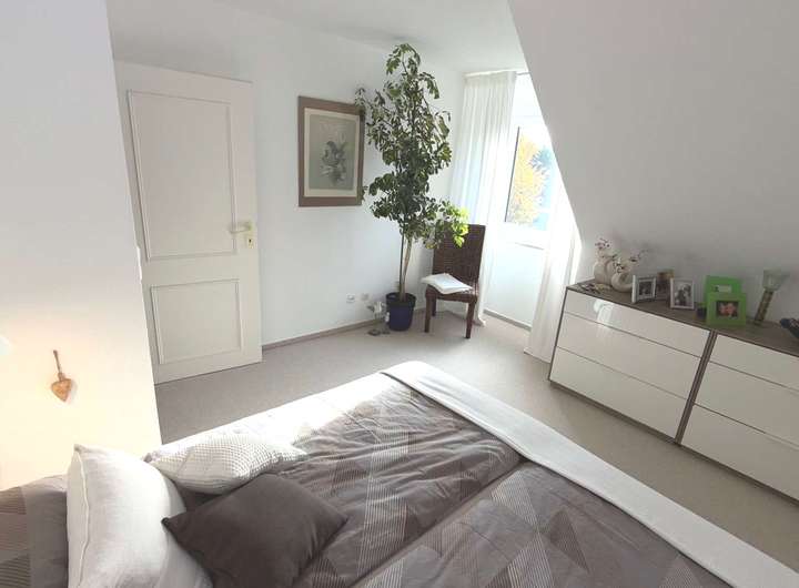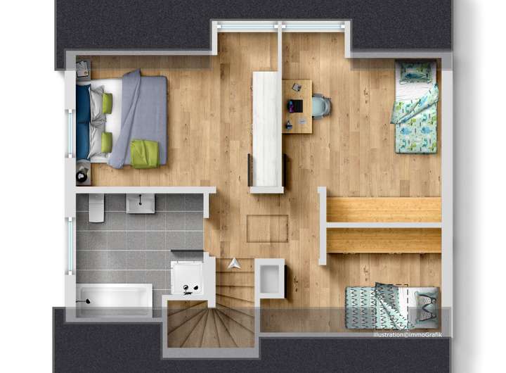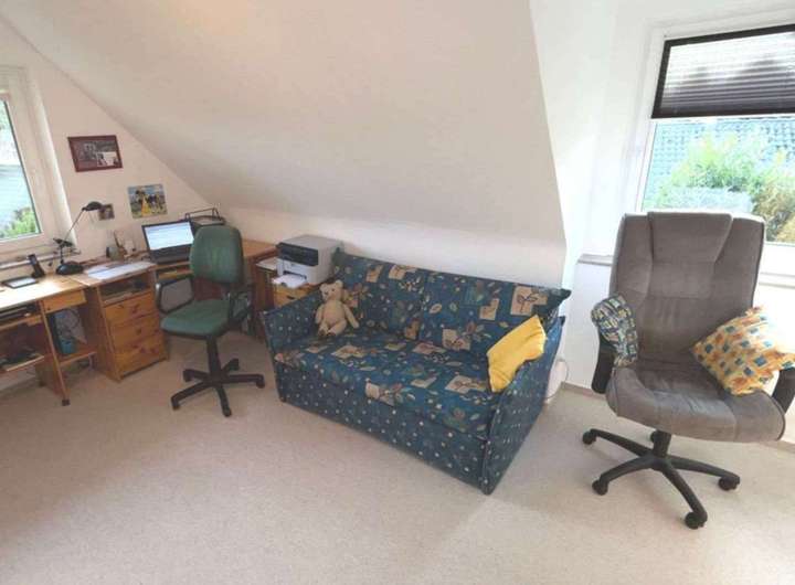 Im Obergeschoss befinden sich drei weitere helle Zimmer. Eine Gaube zur Südseite sorgt für einen optimalen Grundriss und viel Licht.