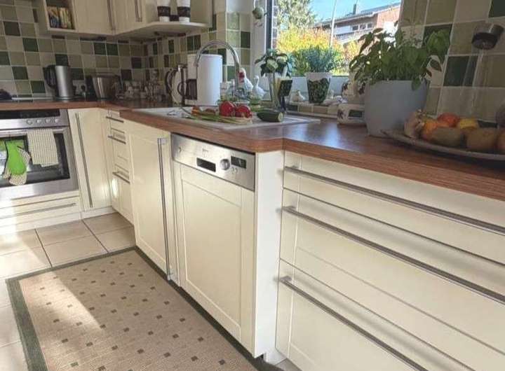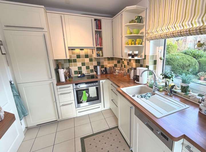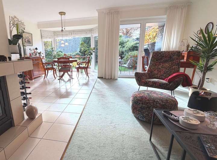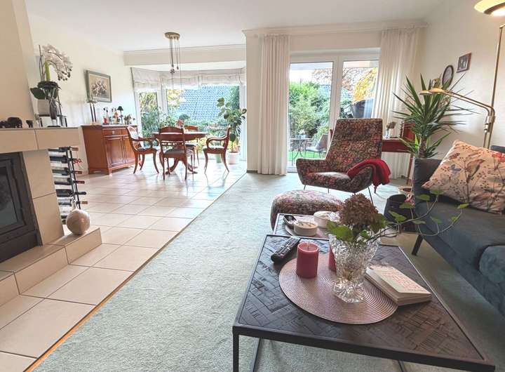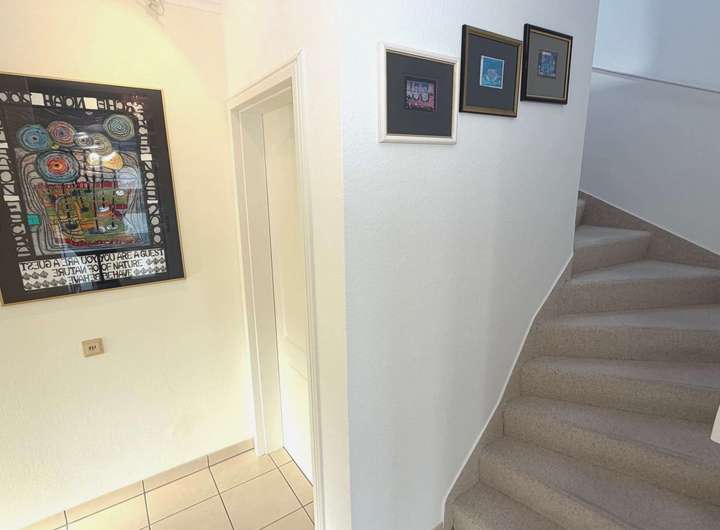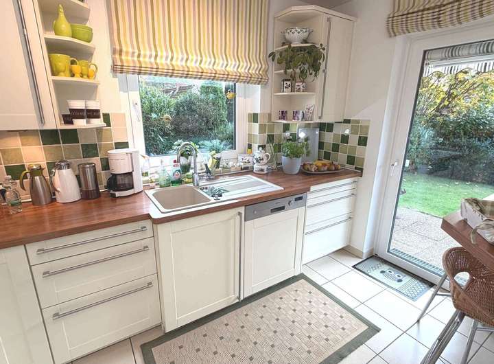 Im Eingangsbereich erwartet Sie ein modernes Gäste-WC. Vom weiterführenden Flur gelangen Sie in das großzügige Wohn- und Esszimmer mit einem gemütlichen Kaminofen. Die angrenzende helle und hochwertige Einbauküche wurde bereits modernisiert und mit NEFF-Markengeräten ausgestattet.