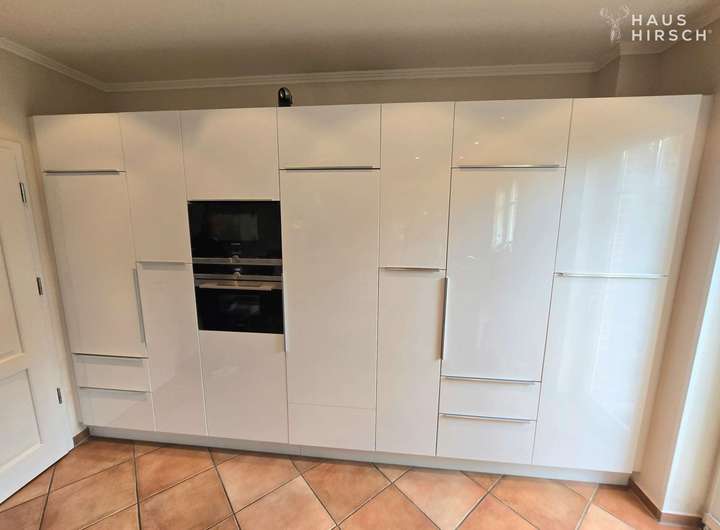 Schon das einladende Entrée mit seiner halb gewendelten Treppe zur Galerie des Obergeschosses vermittelt die Großzügigkeit dieser besonderen Immobilie. Die anschließende, moderne und zeitlos elegante Wohnküche mit Sitzgelegenheiten für bis zu sieben Personen lässt keine Wünsche offen: ein großes Induktionskochfeld, Dampfgarer, Null-Grad-Kühlschrank, Geschirrspüler und Mikrowelle – jeweils von Siemens – stehen für zeitgemäßen Wohnkomfort.