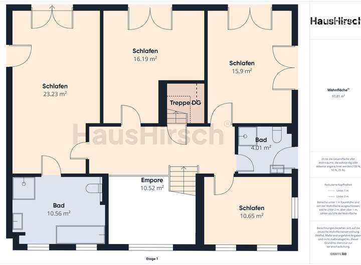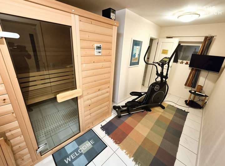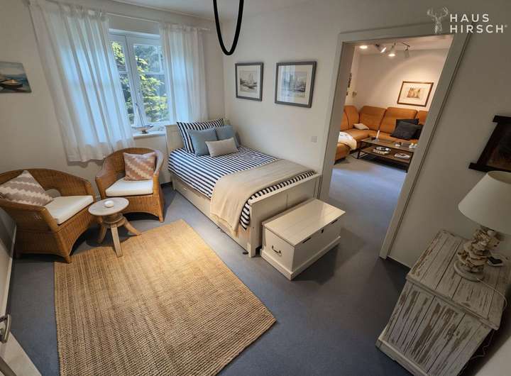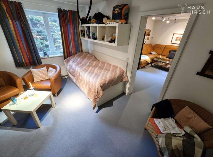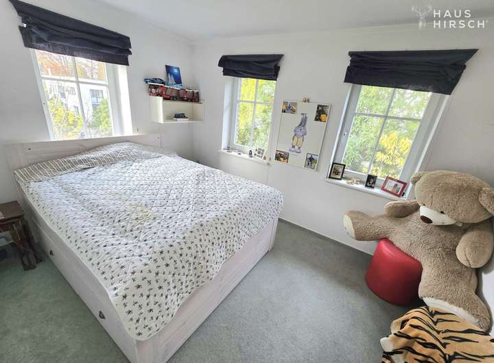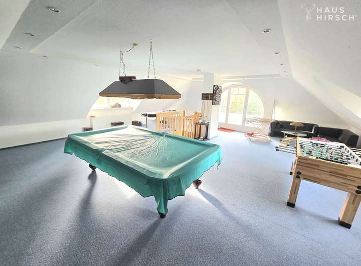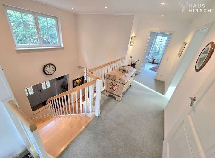 Im Obergeschoss erschließen sich vom großzügigen Galeriebereich aus vier geräumige Schlafzimmer und zwei Bäder, darunter ein Vollbad "ensuite". Über ein kleines Treppenhaus gelangt man in das ausgebaute Dachgeschoss mit Loggia, das ebenso wie das wohnlich gestaltete Souterrain – dieses mit Schlaf- und Wohnbereich, Tageslicht, Sauna und Bad – auf rund 55 m² Raum für eine separate Nutzung bietet.