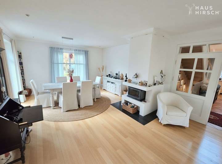 Der durch eine große, doppelflügelige Landhaustür zugängliche Wohnbereich überzeugt mit seiner behaglichen Atmosphäre. Auf fast 55 m² bietet er Platz für eine große Tafel am Kamin sowie eine komfortable Lounge-Ecke zum Entspannen und Genießen. Drei angrenzende Terrassen ermöglichen es, zu jeder Tageszeit die Sonne einzufangen und den liebevoll angelegten Garten mit Teich zu genießen. Ein Büro- bzw. Gästezimmer sowie ein Gästebad runden den Grundriss des Erdgeschosses ab.