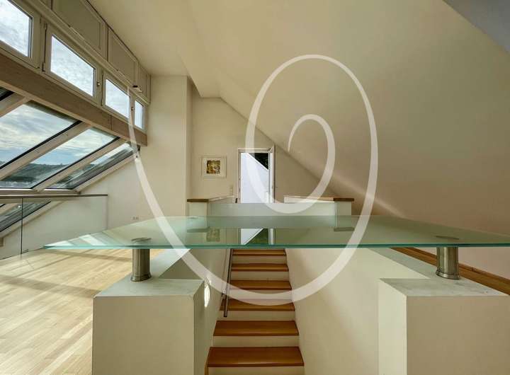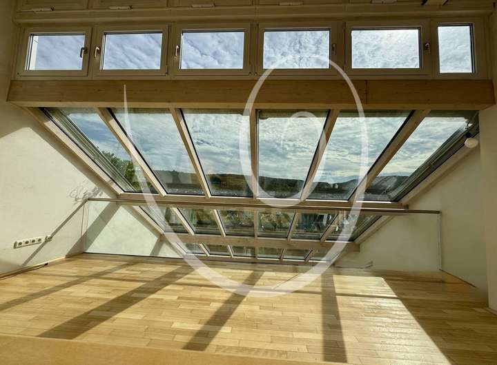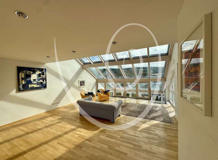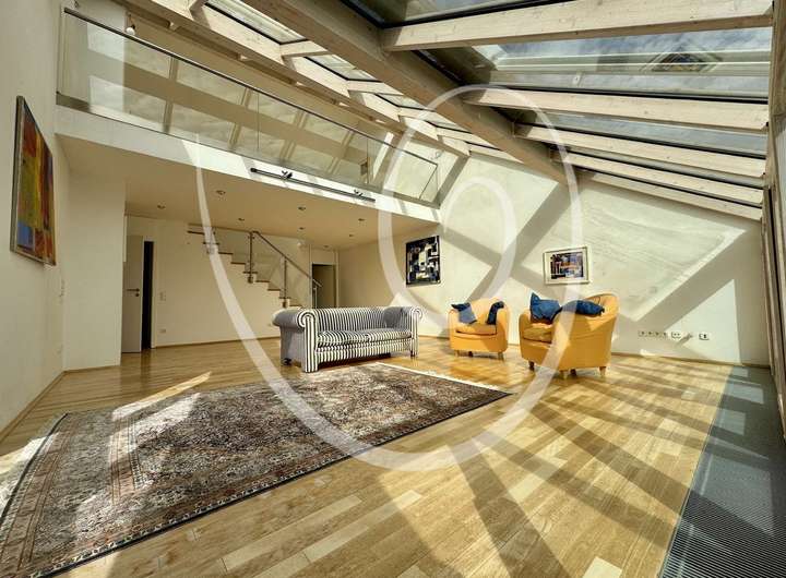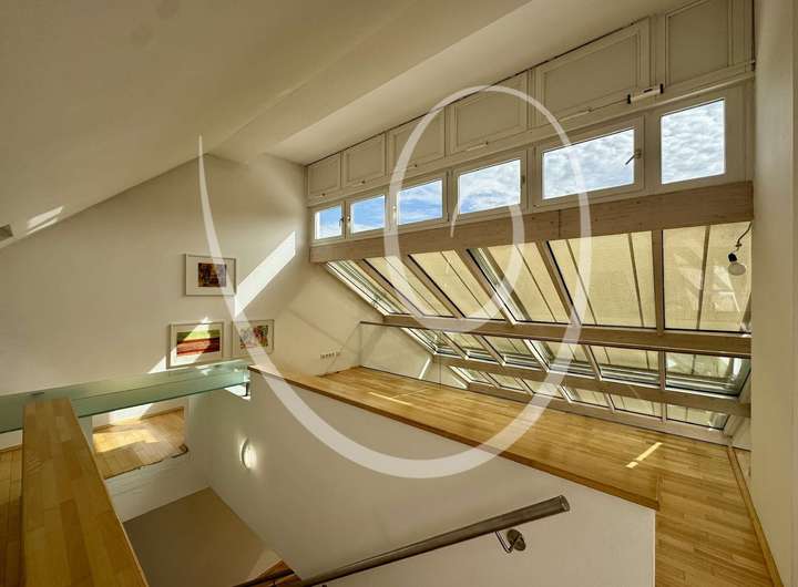 Ein architektonisches Highlight ist die zum Tal hin angeschrägte Dachfläche, die vollständig verglast ist und mit einem außenliegenden Sonnenschutz ausgestattet wurde. Sie sorgt für ein beeindruckendes Raumgefühl und außergewöhnlich viel Tageslicht.