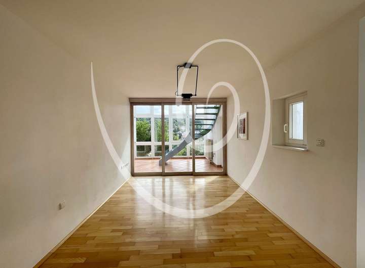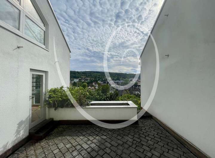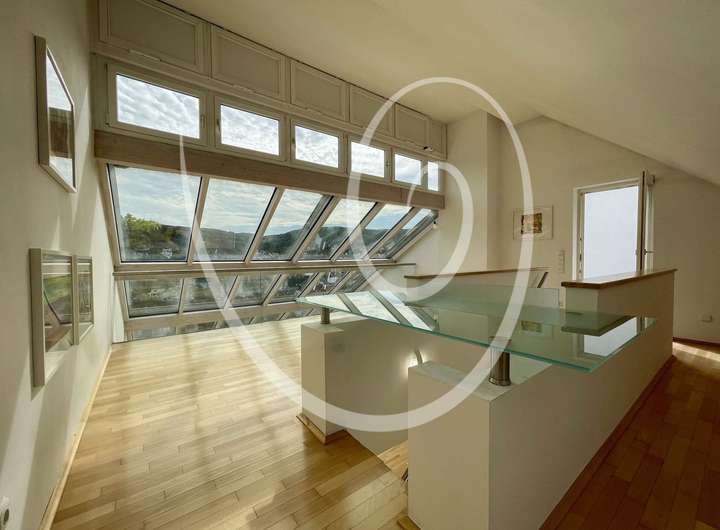 Eine offene Treppe führt vom Wohnzimmer aus in eine Galerieebene, die sich ideal als Arbeitsbereich oder Aufenthaltsraum eignet. Im ersten Obergeschoss erwartet Sie darüberhinaus eine großzügige Dachterrasse mit Weitblick – sowohl in den angrenzenden Wald als auch in die Ferne über das Lorsbacher Tal hinweg. Die Terrasse bietet ideale Voraussetzungen für erholsame Stunden im Freien.