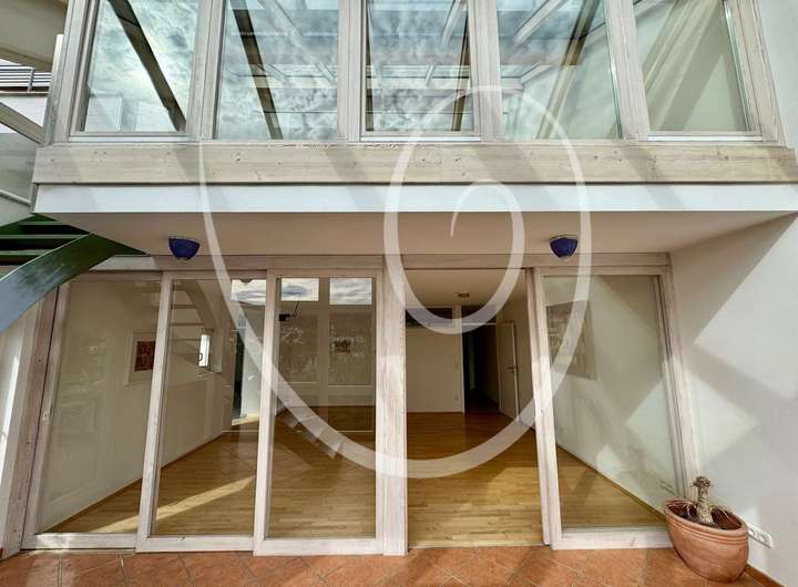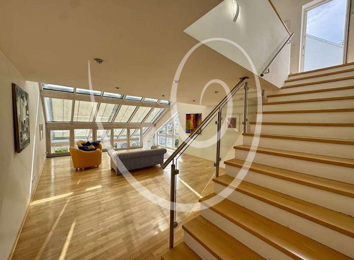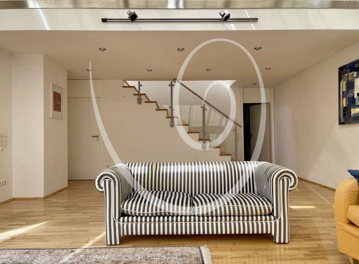 Über eine weitere Treppe auf der Terrasse gelangt man in den angegliederten Garten. Die offene und großzügige Grundrissgestaltung sorgt auch auf dieser Ebene für ein außergewöhnliches Wohngefühl.