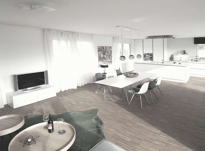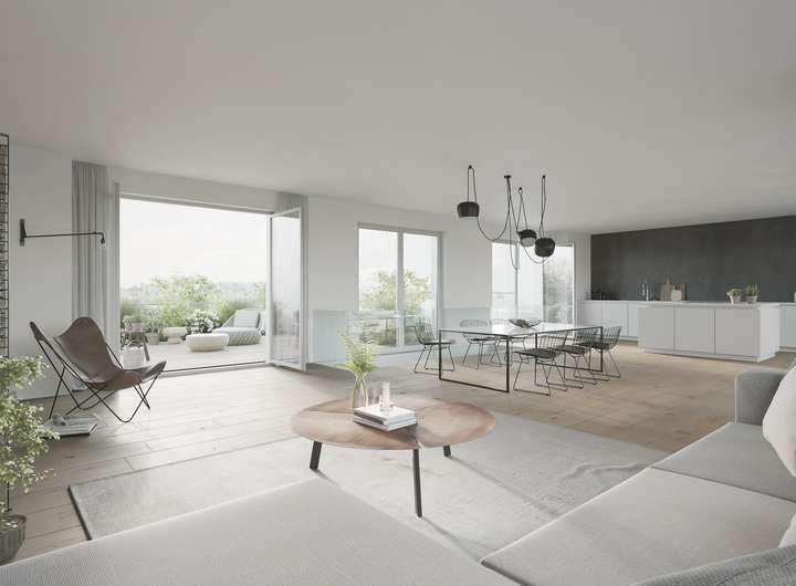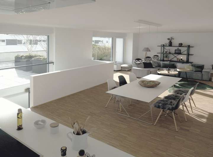 Großer, offener Wohn-/Ess-/Kochbereich mit direktem Austritt auf die Dachterrasse – Süd-/West-Licht, niemand über Ihnen.
