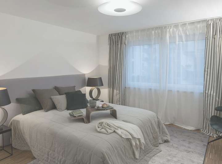 • Großformatige Fliesen in Bädern und Funktionszonen für ein ruhiges, modernes Gesamtbild