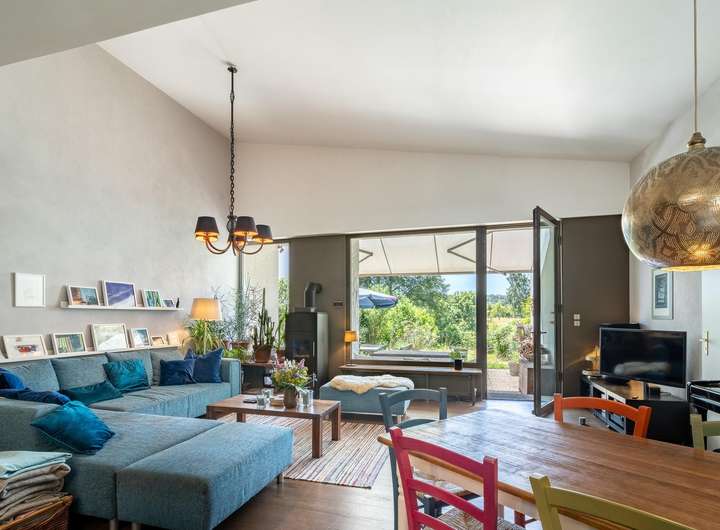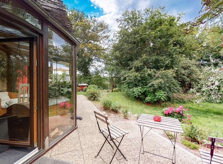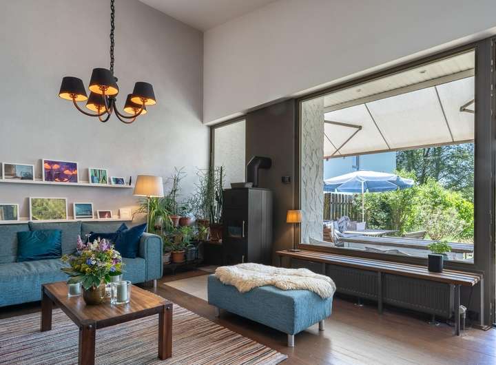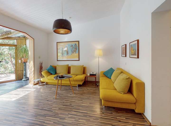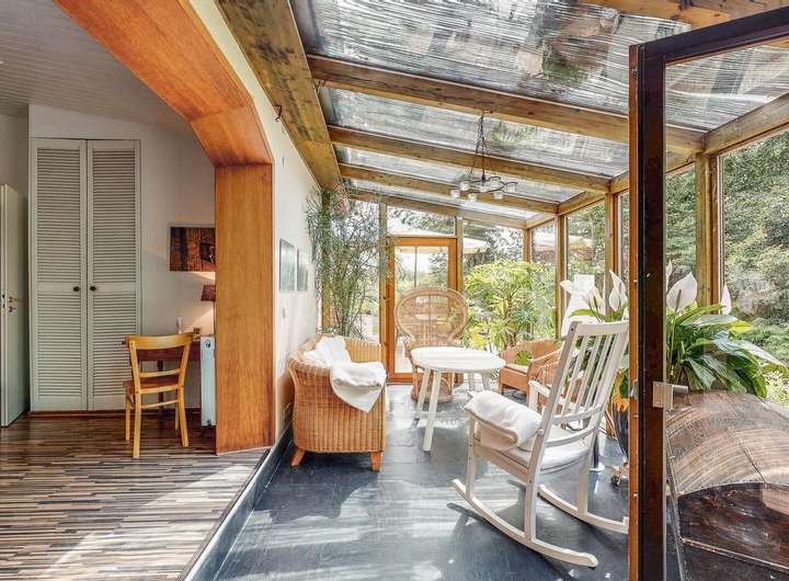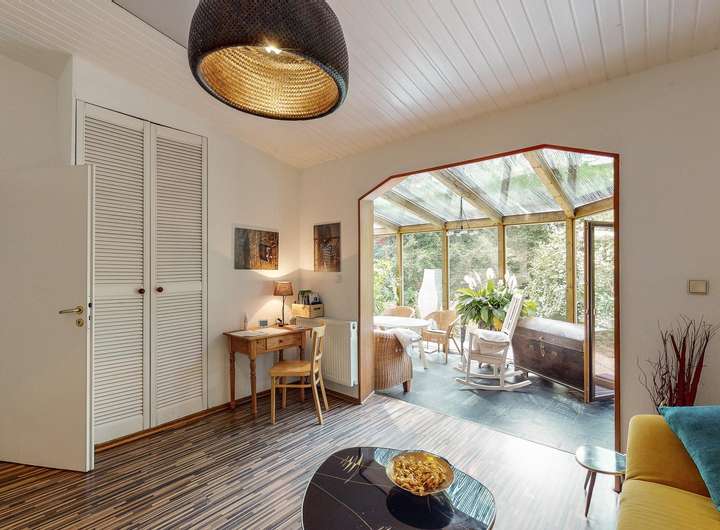 ◼︎ Der ganzjährig nutzbare, beheizte Wintergarten mit Blick ins Grüne ist Teil der Einliegerwohnung und bietet zusätzlichen Raum zum Entspannen.