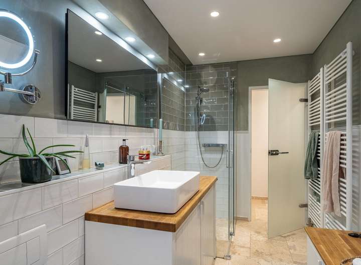 ◼︎ Ein neu gestaltetes Bad im Retro-Design mit Badewanne und bodengleicher Dusche ziert die größere Wohnung.