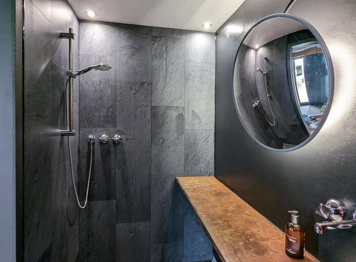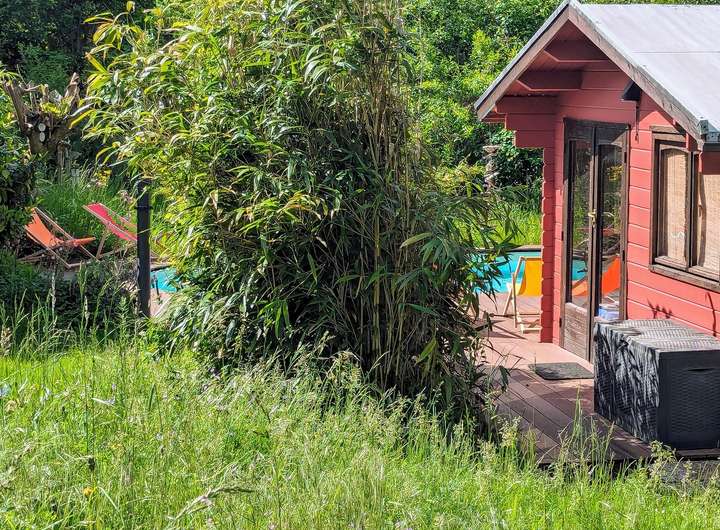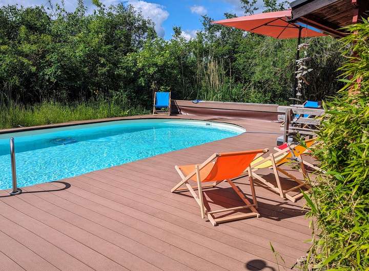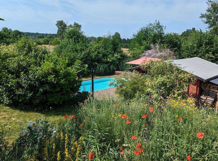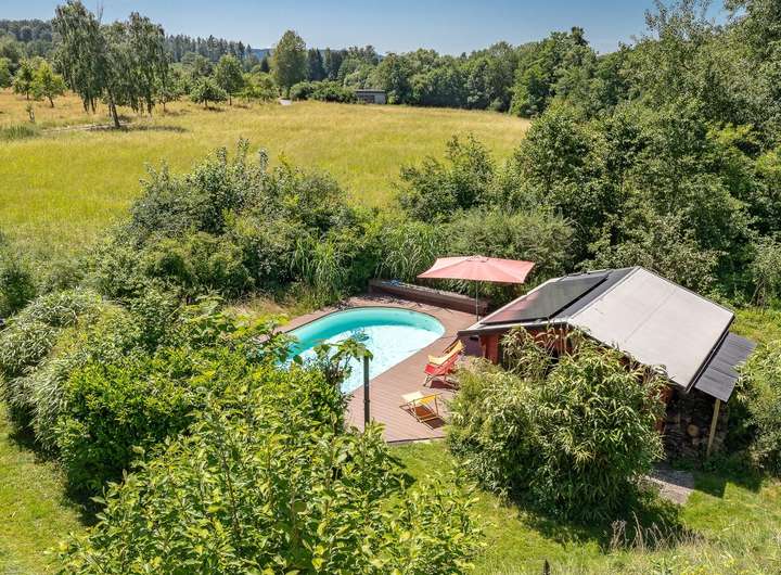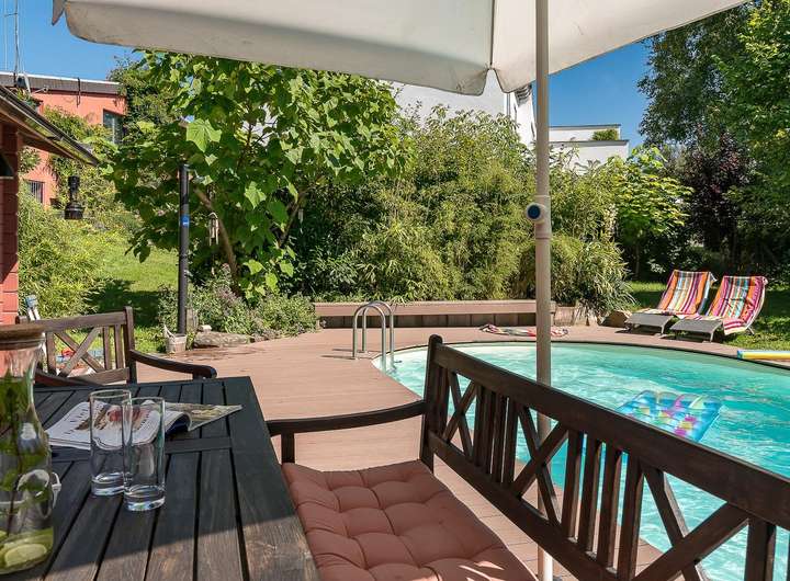 Das Highlight sind der von außen nicht einsehbare Pool und eine Gartensauna mit Dusche, die absolute Privatsphäre versprechen.