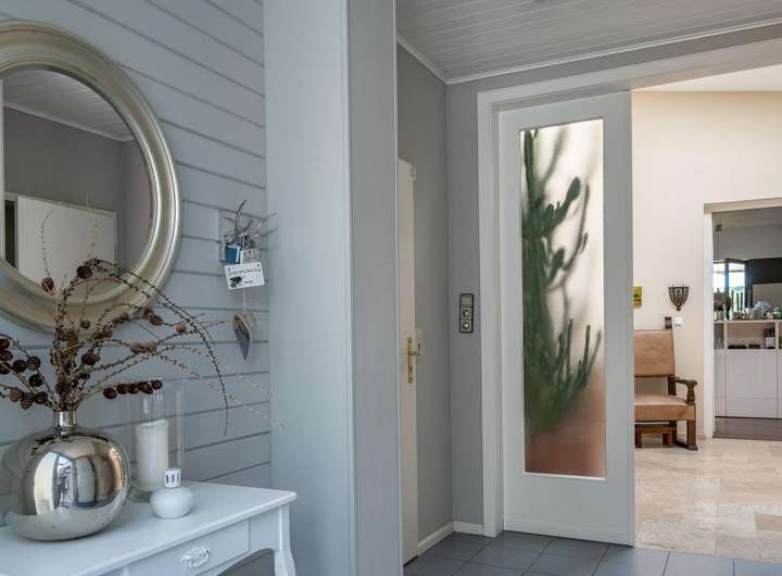 • Böden sind überwiegend mit Parkett, Holzdielen und Fliesen (Travertin)