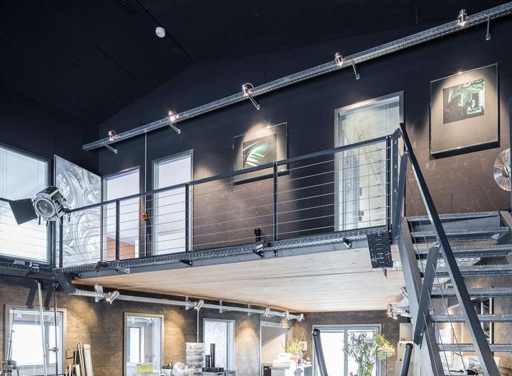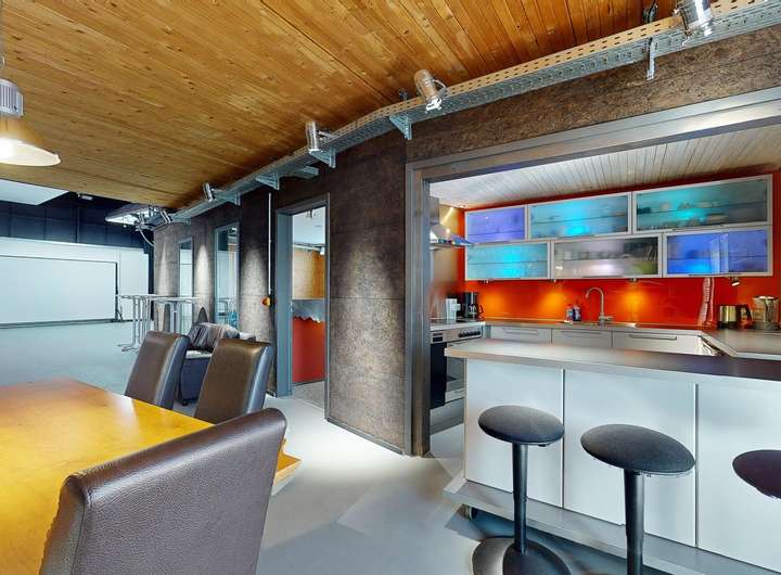 • Halle & Büros im EG: 249 m², mit ebenerdiger Autoeinfahrt, (Sektionaltor: 3,12 m × 2,41 m), ursprüngl. als Fotostudio genutzt, im stylischem Industrie-Loft-Charakter, ursprünglich voll verglaste Nordseite der Halle, (wäre bei Bedarf wiederherstellbar).