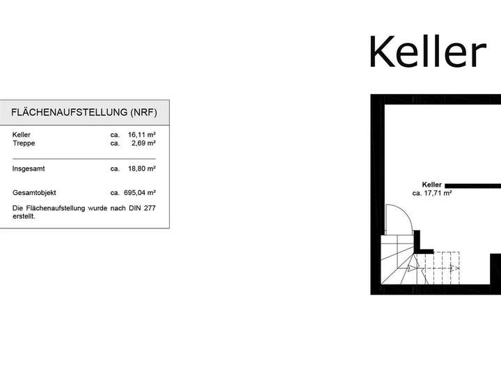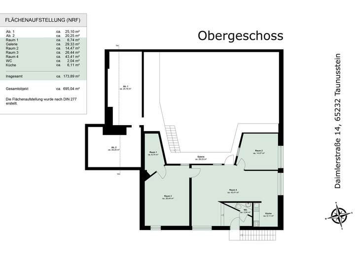◼︎ Das Gebäude erstreckt sich über 720 m² (Gesamtnutzfläche nach DIN 277), größtenteils auf einer Ebene und umfasst zwei Wohnungen, (178 m² + 105 m²), sowie eine 249 m² große Halle mit Büroräumen.