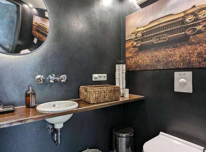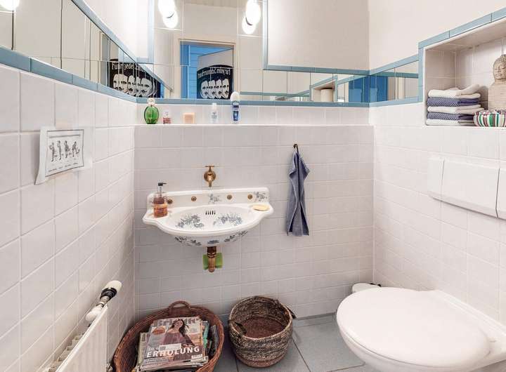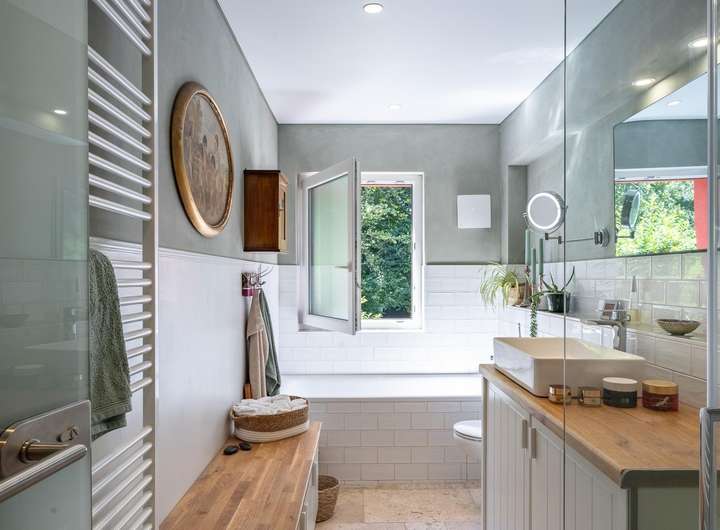 • 3 Bäder, 3 Gäste-WCs, neu gestaltetes Bad im Retro-Design mit Badewanne und bodengleicher Dusche in der Hauptwohnung.
