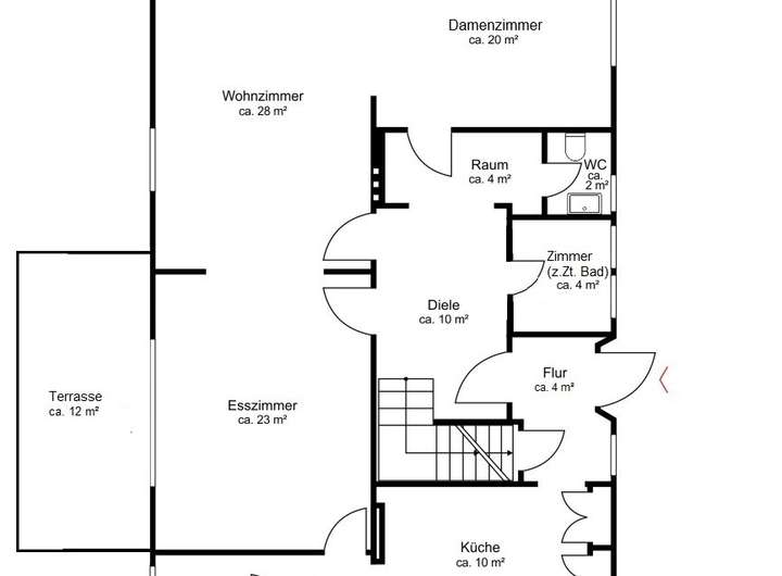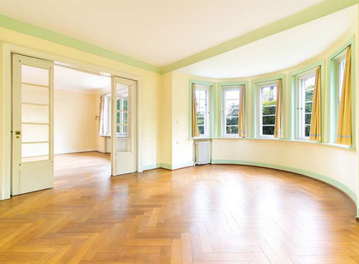 - Zahlreiche originale Stilelemente der Bauzeit, wie Holzdielenböden und kassettierte Türen