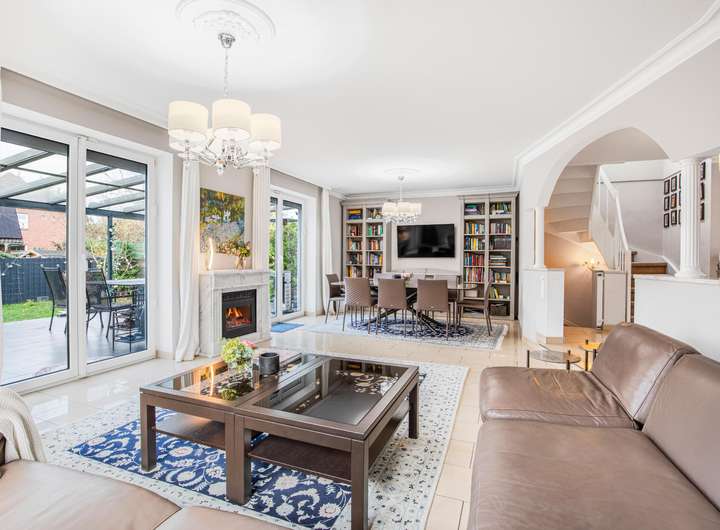 Sie betreten das Haus und werden von einem großzügigen Eingangsbereich empfangen, der sofort eine einladende und offene Atmosphäre vermittelt. Geradeaus öffnet sich im Splitlevel mit einigen Stufen der weitläufige Wohn- und Essbereich (Deckenhöhe ca. 2,63 m) mit seinem herrlichen Blick auf die sehr große, überdachte Terrasse und den schönen, eingewachsenen Garten. Die absolute Helligkeit des Wohnbereiches wird auch durch das Seitenfenster zur Westseite ergänzt.