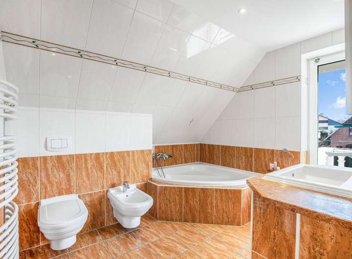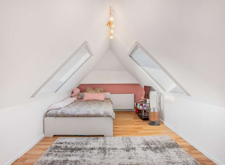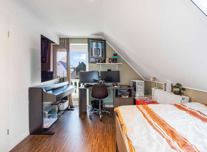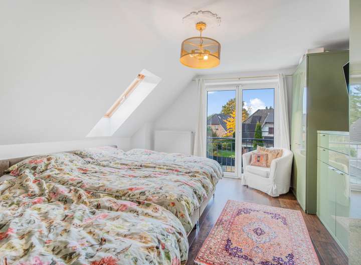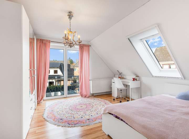 Im Obergeschoss erwarten Sie zwei geräumige Kinderzimmer - eines davon mit Balkon nach Südwesten, sowie ein Arbeitszimmer und ein schönes Schlafzimmer, welches sich neben einem luxuriösen Badezimmer mit Fußbodenerwärmung befindet. Der ausgebaute, helle Dachboden wurde zu einem schönen wohnlichen Raum gestaltet.